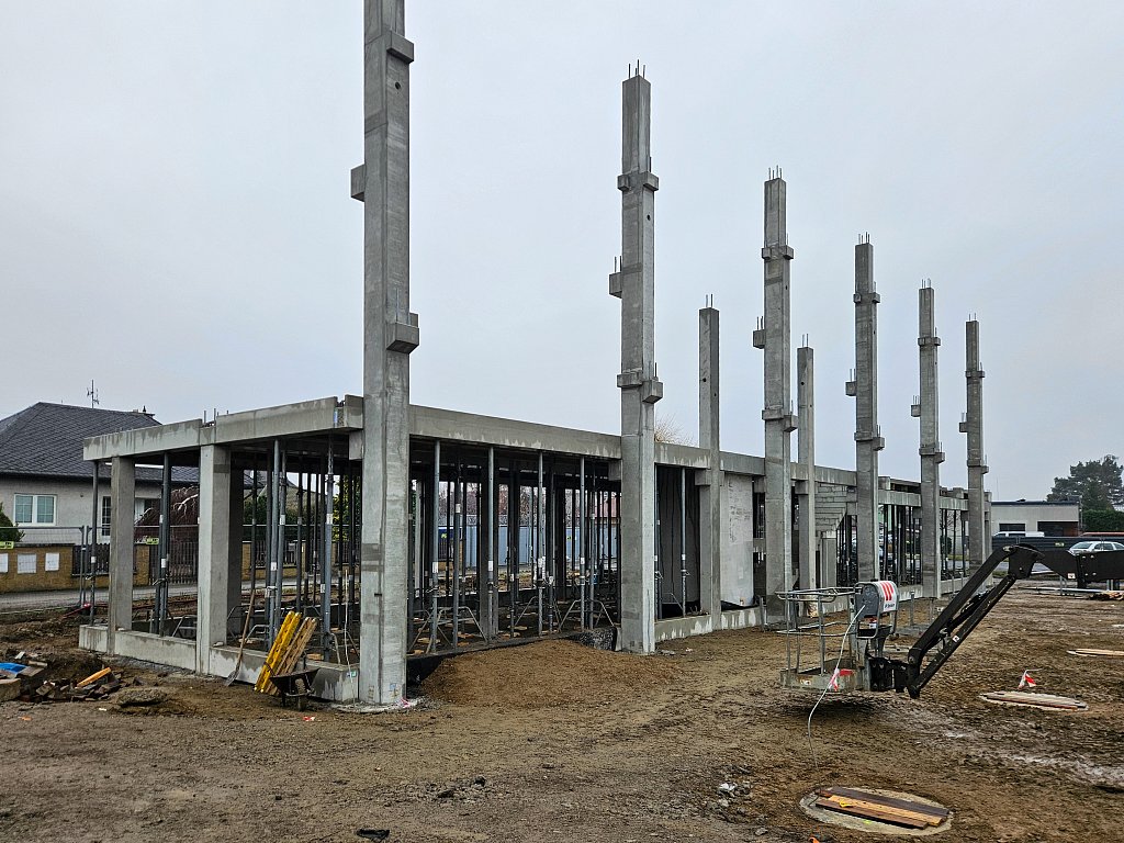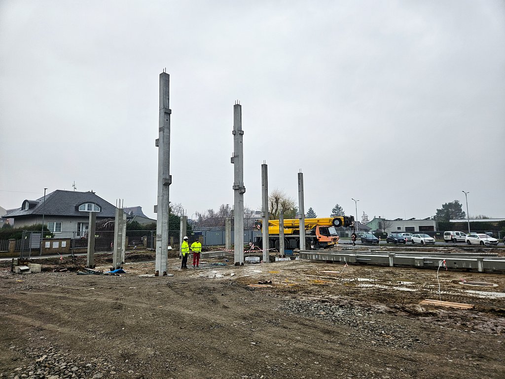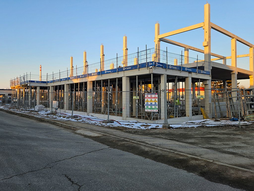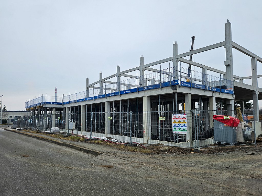 Realizujeme moderní novostavbu haly, která kombinuje efektivní skladové prostory s komfortním kancelářským zázemím. Stavba se skládá ze dvou propojených funkčních celků – třípodlažní administrativní části a dvoupodlažní skladové haly, s půdorysnými rozměry 30,3 × 34,05 metrů a výškou 11,6 metrů. Konstrukce je řešena převážně jako železobetonový skelet se sloupy, průvlaky a vazníky, založení proběhlo pomocí monolitických pilot. Administrativní část stavby je vyzděna z keramických bloků Porotherm Profi s kontaktním zateplovacím systémem, doplněná trapézovým plechem nebo fasádními kazetami. Skladová část je opláštěna sendvičovými panely. Výplně otvorů v rámci celé stavby jsou plastové, šedé barvy, kotvené pomocí pomocné ocelové konstrukce. Vnitřní členění objektu zajišťují keramické bloky a lehké příčky, včetně prosklených variant.