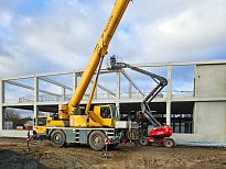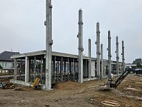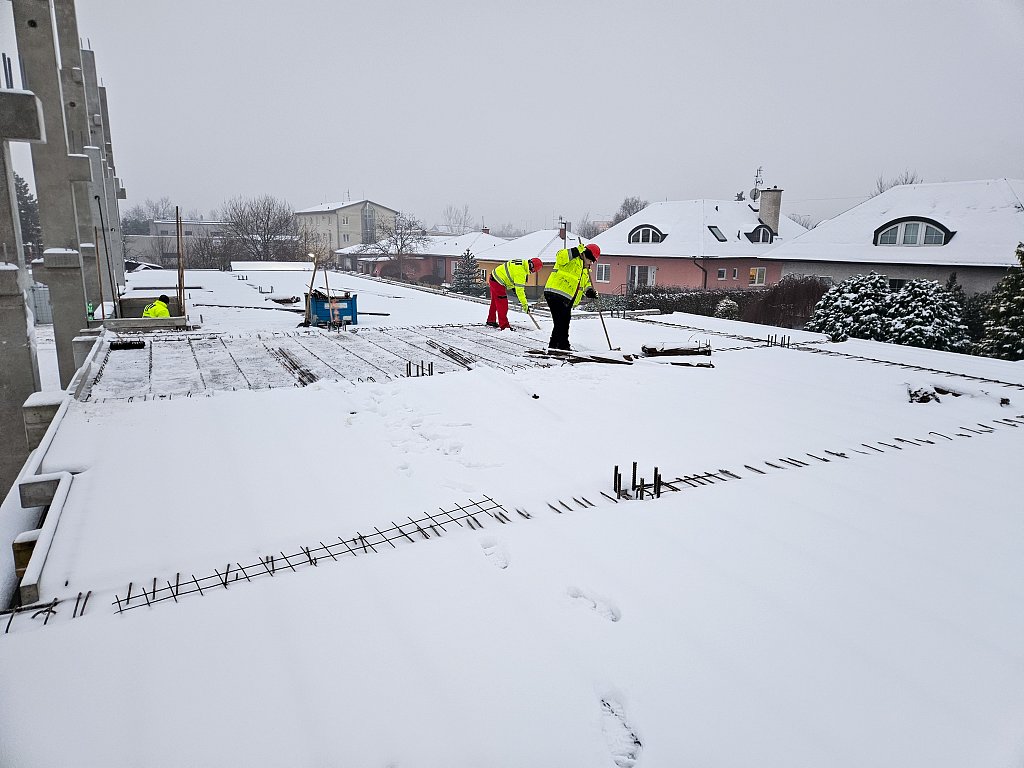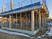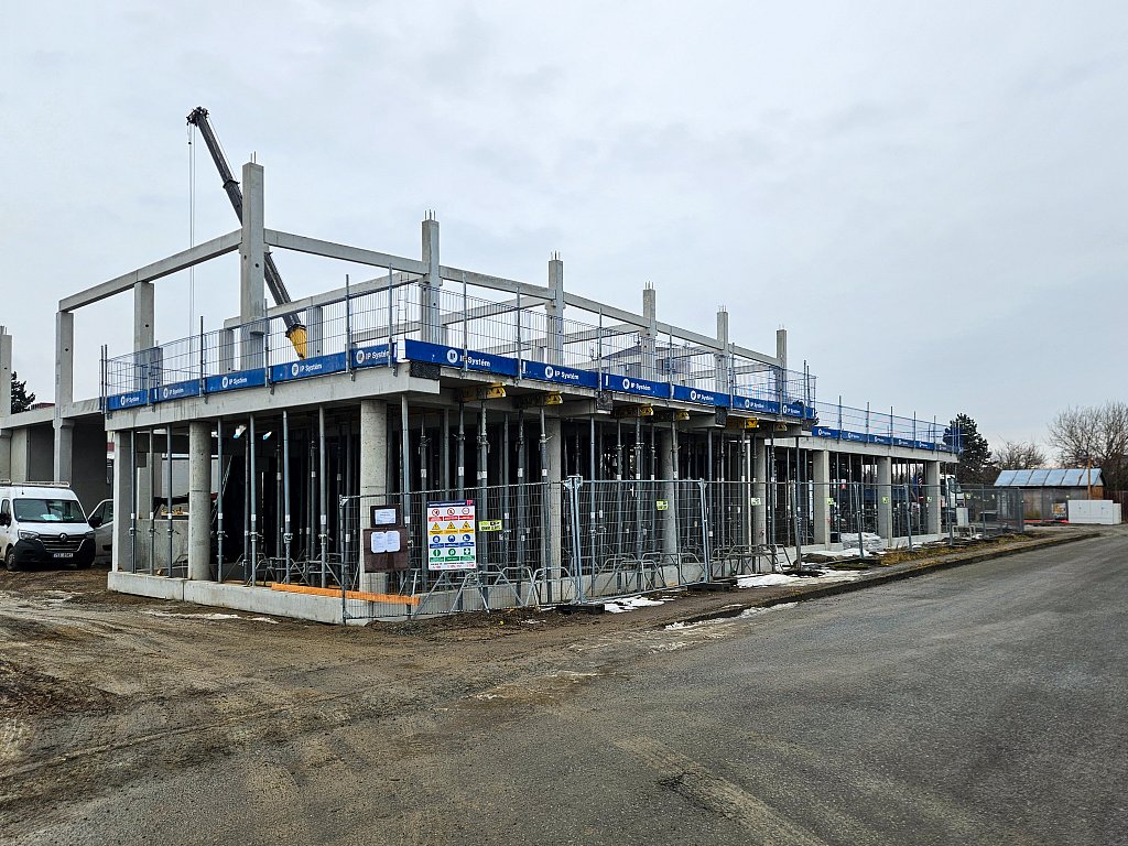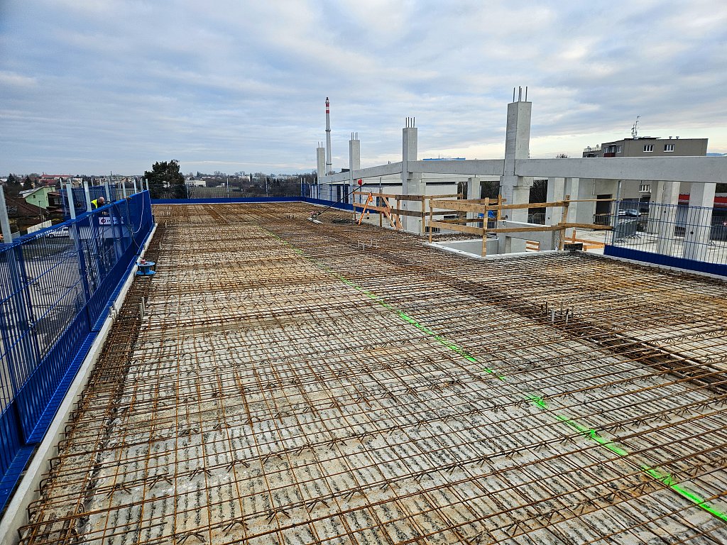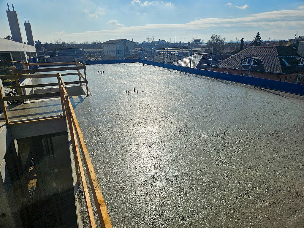 Realizujeme moderní novostavbu haly, která kombinuje efektivní skladové prostory s komfortním kancelářským zázemím. Stavba se skládá ze dvou propojených funkčních celků – třípodlažní administrativní části a dvoupodlažní skladové haly, s půdorysnými rozměry 30,3 × 34,05 metrů a výškou 11,6 metrů. Konstrukce je řešena převážně jako železobetonový skelet se sloupy, průvlaky a vazníky, založení proběhlo pomocí monolitických pilot. Administrativní část stavby je vyzděna z keramických bloků Porotherm Profi s kontaktním zateplovacím systémem, doplněná trapézovým plechem nebo fasádními kazetami. Skladová část je opláštěna sendvičovými panely. Výplně otvorů v rámci celé stavby jsou plastové, šedé barvy, kotvené pomocí pomocné ocelové konstrukce. Vnitřní členění objektu zajišťují keramické bloky a lehké příčky, včetně prosklených variant.