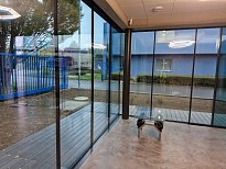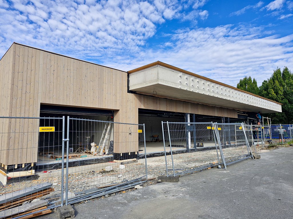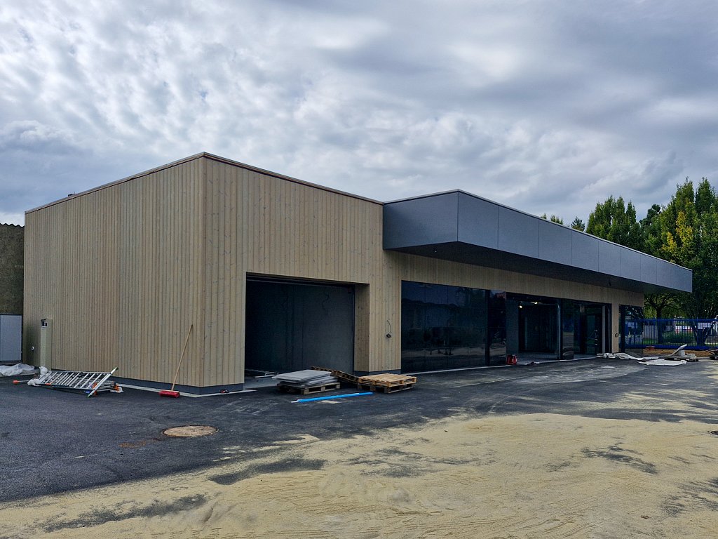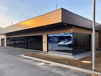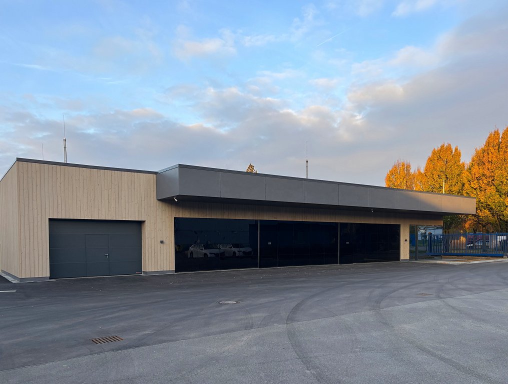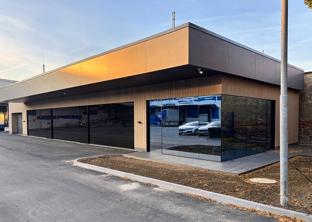Jednopodlažní stavba se dispozičně dělí na garážovou část, zázemí pro investora a jeho partnery, technické a sociální zázemí a myčku pro osobní automobily. Součástí objektu je také venkovní dřevěná terasa pro letní posezení. Konstrukčně je budova řešena jako železobetonový monolitický celek. Obvodové stěny jsou opatřeny provětrávanou fasádou s vertikálními dřevěnými lamelami z termo borovice. Předsazené části střechy a atiky jsou obloženy deskami Cembrit a výplně otvorů tvoří hliníkové prvky v kombinaci se sklem. Stavbu charakterizuje kombinace prémiových materiálů – pohledového betonu, dřeva, hliníku a skla. Realizace trvala devět měsíců.