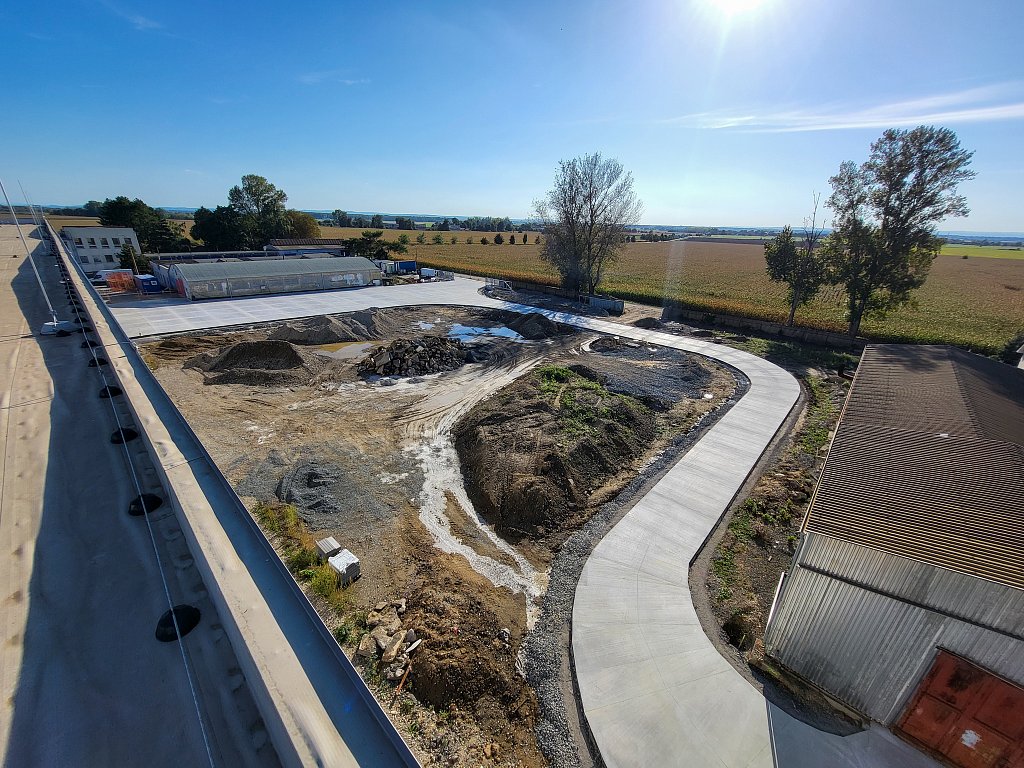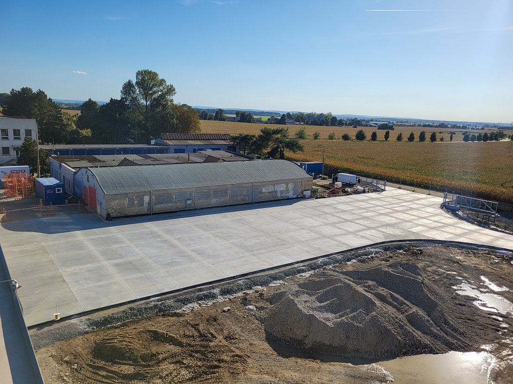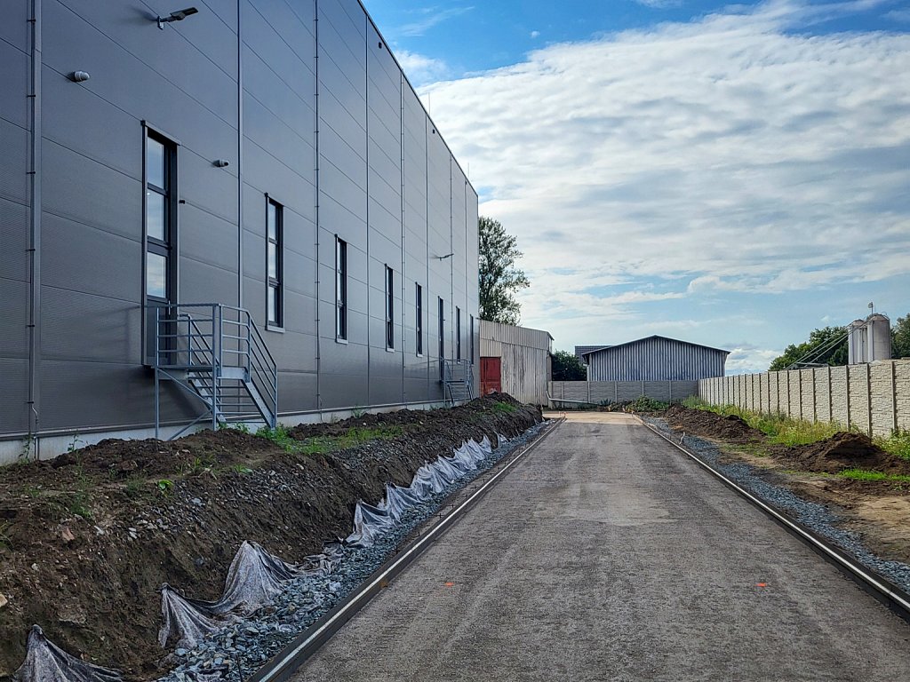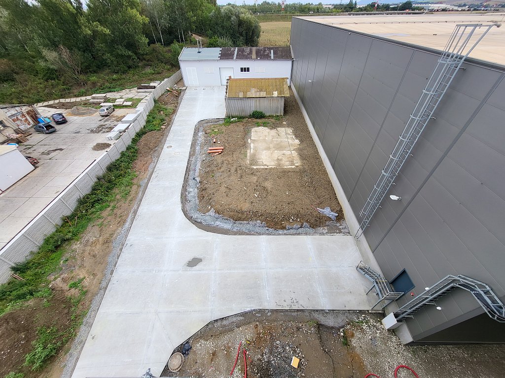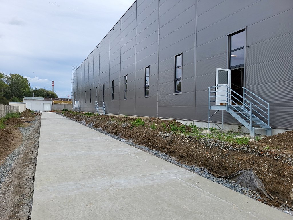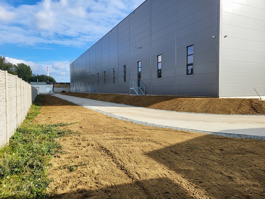 V červenci 2025 jsme na úspěšnou spolupráci navázali provedením venkovních zpevněných ploch – obslužných komunikací. Zajišťovali jsme přípravné práce a hrubé terénní úpravy, vsakování dešťových vod, podkladní vrstvy zpevněných ploch, cementobetonový kryt, modelaci finálního terénu a další doplňkové činnosti (mimo jiné sanaci, dlážděné plochy a drobné základové konstrukce). V rámci přípravných prací bylo kromě přesunu zeminy nutné vybourat stávající betonové plochy a objekty, rozebrat panelové plochy a rozdrtit stavební suť. Objem bouraných ploch byl téměř 450 m3. Podloží zpevněných ploch bylo stabilizováno hydraulickým pojivem, podkladní vrstvy byly provedeny ze štěrkodrtě a kameniva stmeleného cementem. Celková plocha betonáže činila přibližně 3 200 m2 a zvládli jsme ji za čtyři dny. Modelace finálního terénu probíhala na ploše téměř 6 000 m2. Veškeré práce jsme dokončili během tří měsíců.