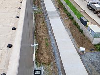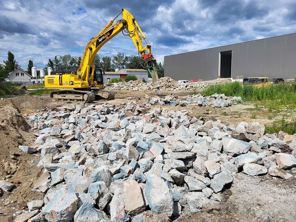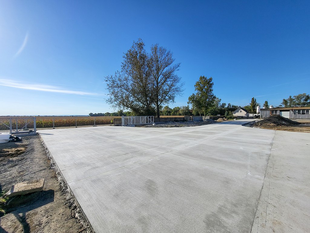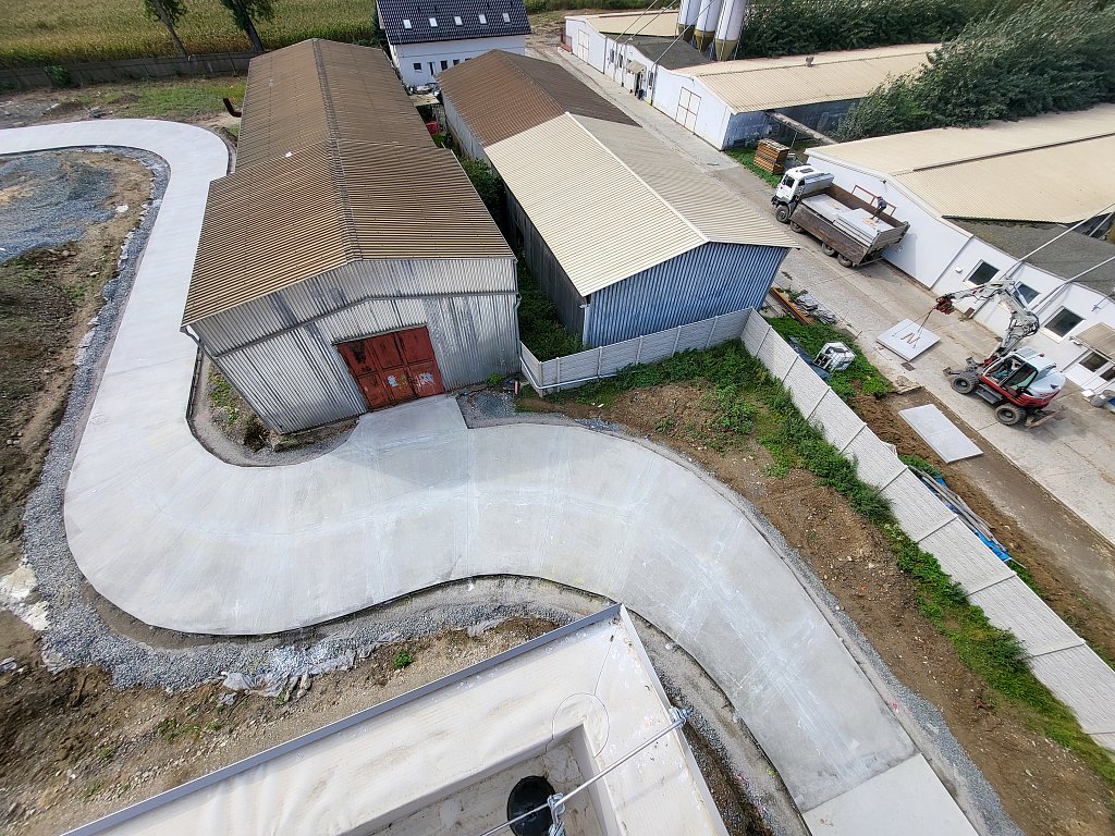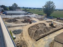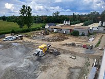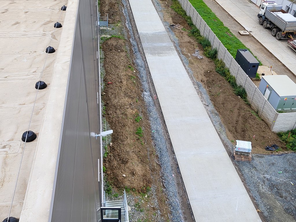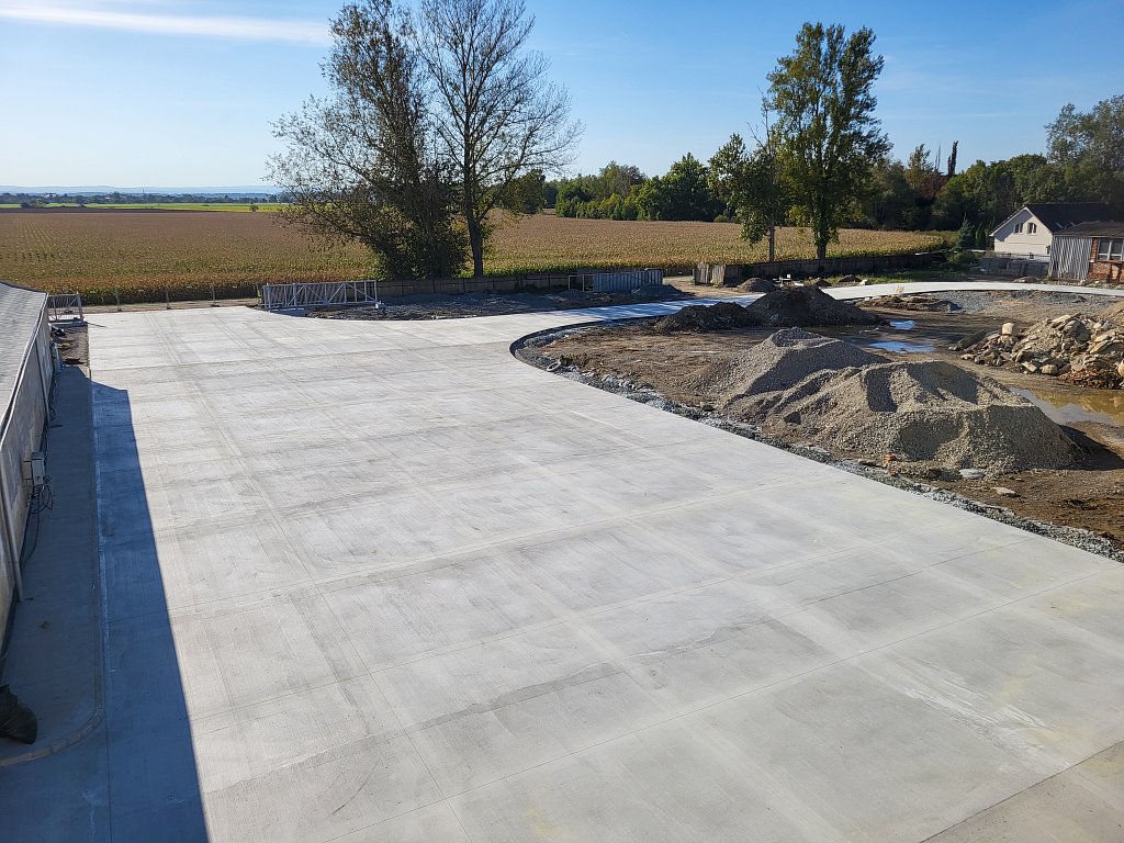 V červenci 2025 jsme na úspěšnou spolupráci navázali provedením venkovních zpevněných ploch – obslužných komunikací. Zajišťovali jsme přípravné práce a hrubé terénní úpravy, vsakování dešťových vod, podkladní vrstvy zpevněných ploch, cementobetonový kryt, modelaci finálního terénu a další doplňkové činnosti (mimo jiné sanaci, dlážděné plochy a drobné základové konstrukce). V rámci přípravných prací bylo kromě přesunu zeminy nutné vybourat stávající betonové plochy a objekty, rozebrat panelové plochy a rozdrtit stavební suť. Objem bouraných ploch byl téměř 450 m3. Podloží zpevněných ploch bylo stabilizováno hydraulickým pojivem, podkladní vrstvy byly provedeny ze štěrkodrtě a kameniva stmeleného cementem. Celková plocha betonáže činila přibližně 3 200 m2 a zvládli jsme ji za čtyři dny. Modelace finálního terénu probíhala na ploše téměř 6 000 m2. Veškeré práce jsme dokončili během tří měsíců.