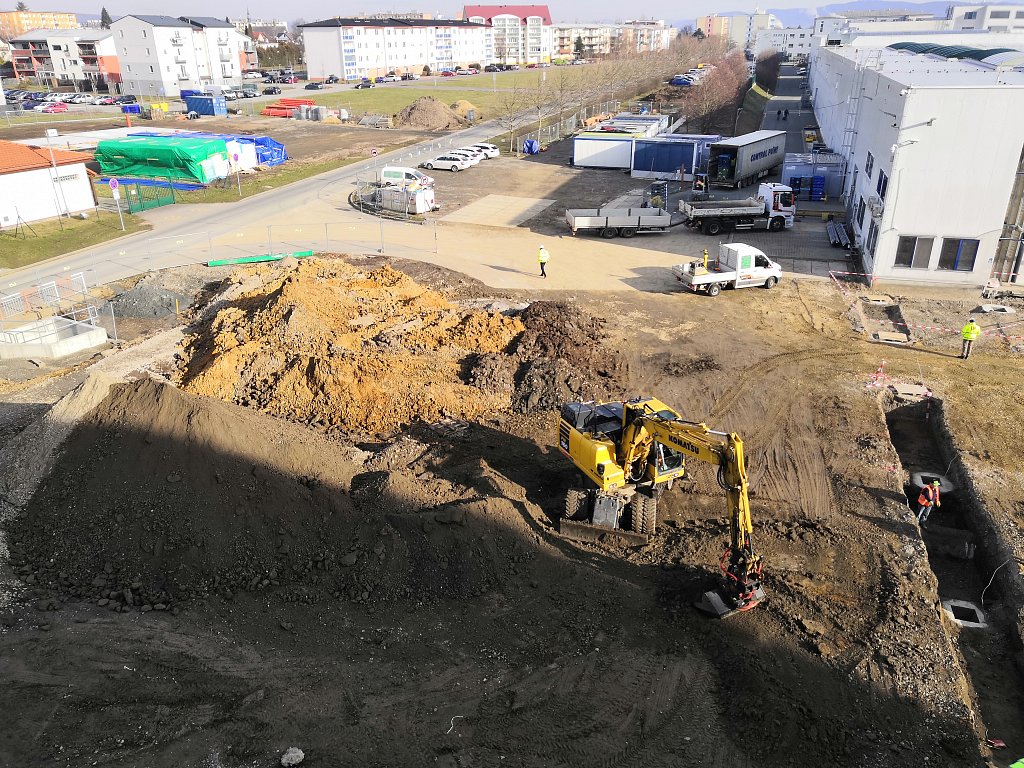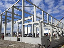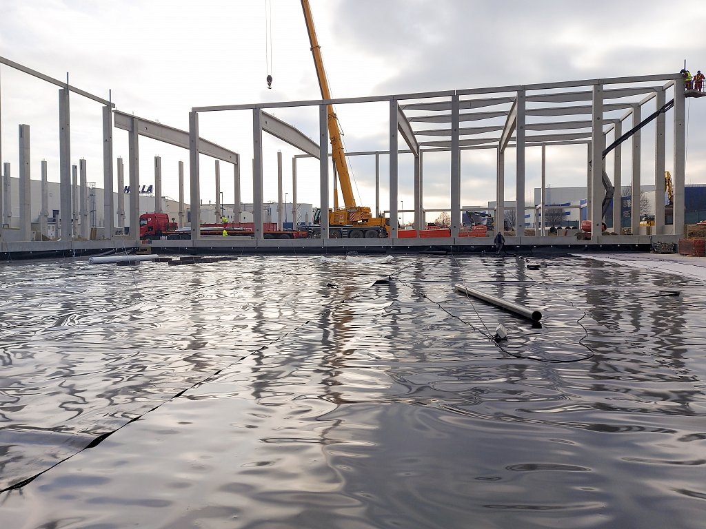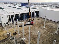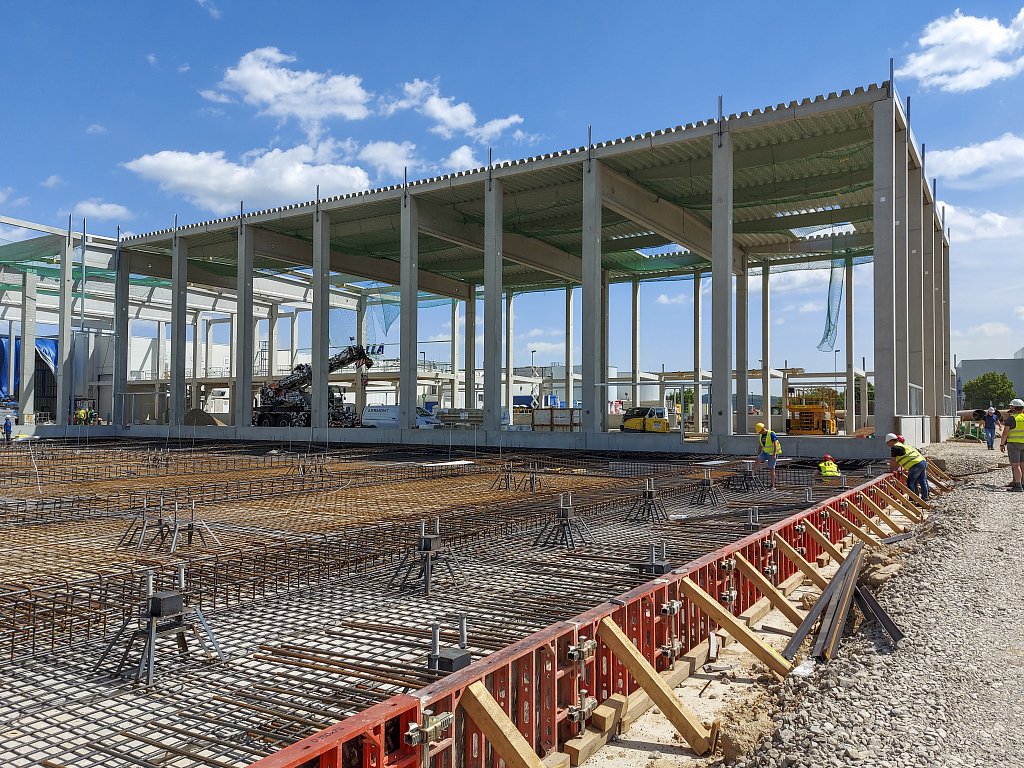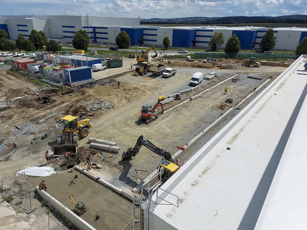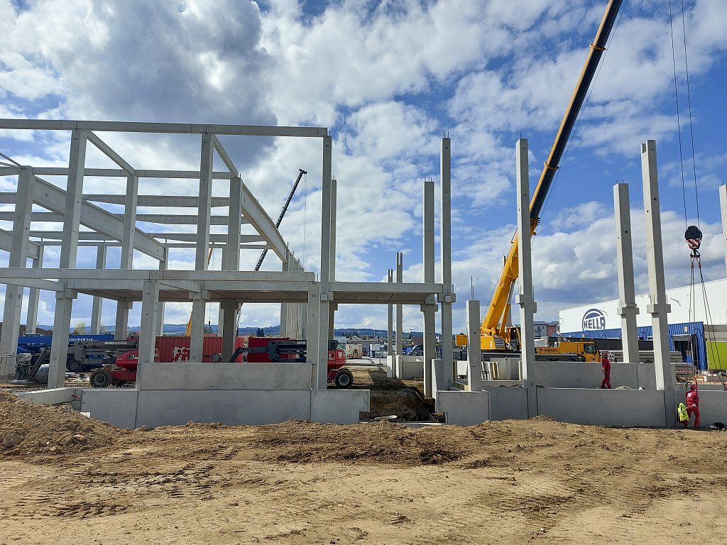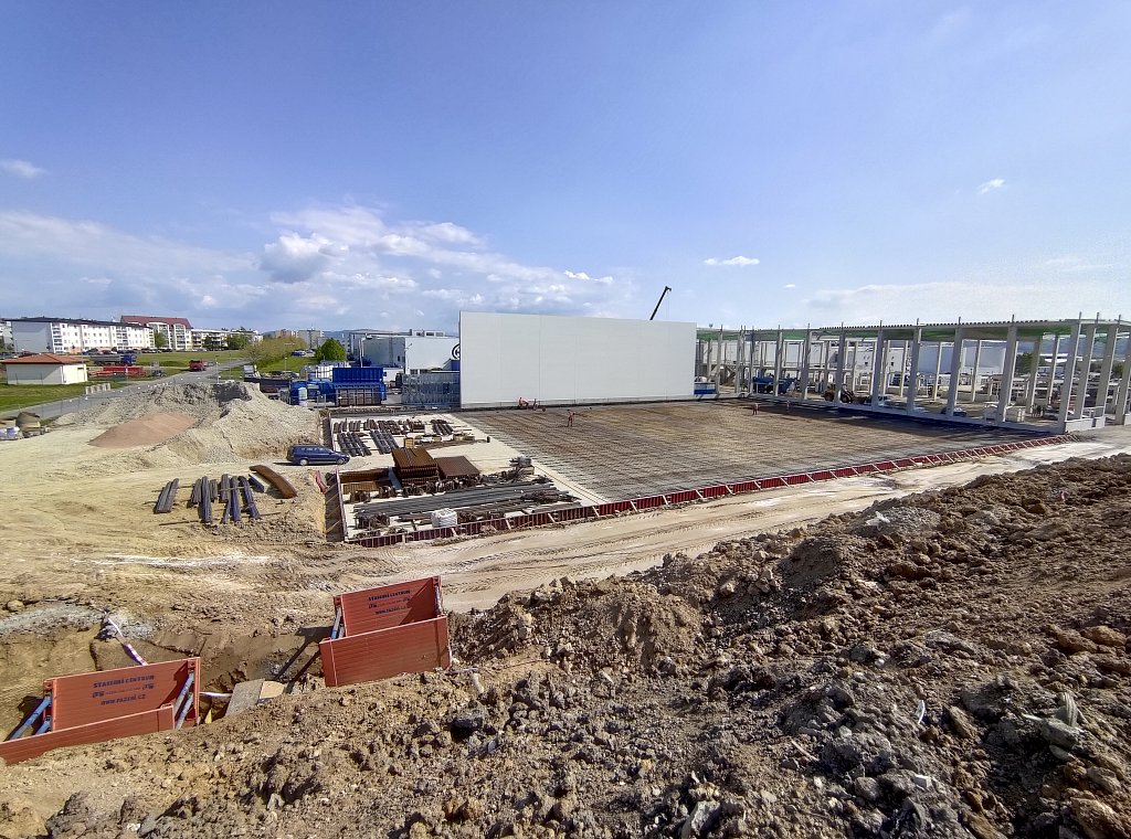 Obě etapy nového skladu jsou napojeny na stávající skladovou halu s expedicí a jsou navzájem provozně propojeny. Z důvodu zachování nepřetržitého provozu ve stávajícím objektu bylo nutné postavit na začátku realizace provizorní dělicí stěnu mezi novým a původním skladem. Součástí realizace jsou také rozsáhlé zemní práce spojené s bouráním stávajících zpevněných ploch. Zajistili jsme stabilizaci podloží, v rámci areálu jsme provedli zpevněné asfaltové a betonové plochy, dešťovou a splaškovou kanalizaci, dva retenční objekty s odlučovači lehkých kapalin, přeložku požárního vodovodu, přeložku plynové přípojky a mnoho dalšího. Aby těch čísel nebylo málo, doplníme ještě, že prefabrikovaná železobetonová konstrukce nového skladu se skládá z více než 400 kusů prefabrikátů, které vznikly v našem olomouckém výrobním závodě.